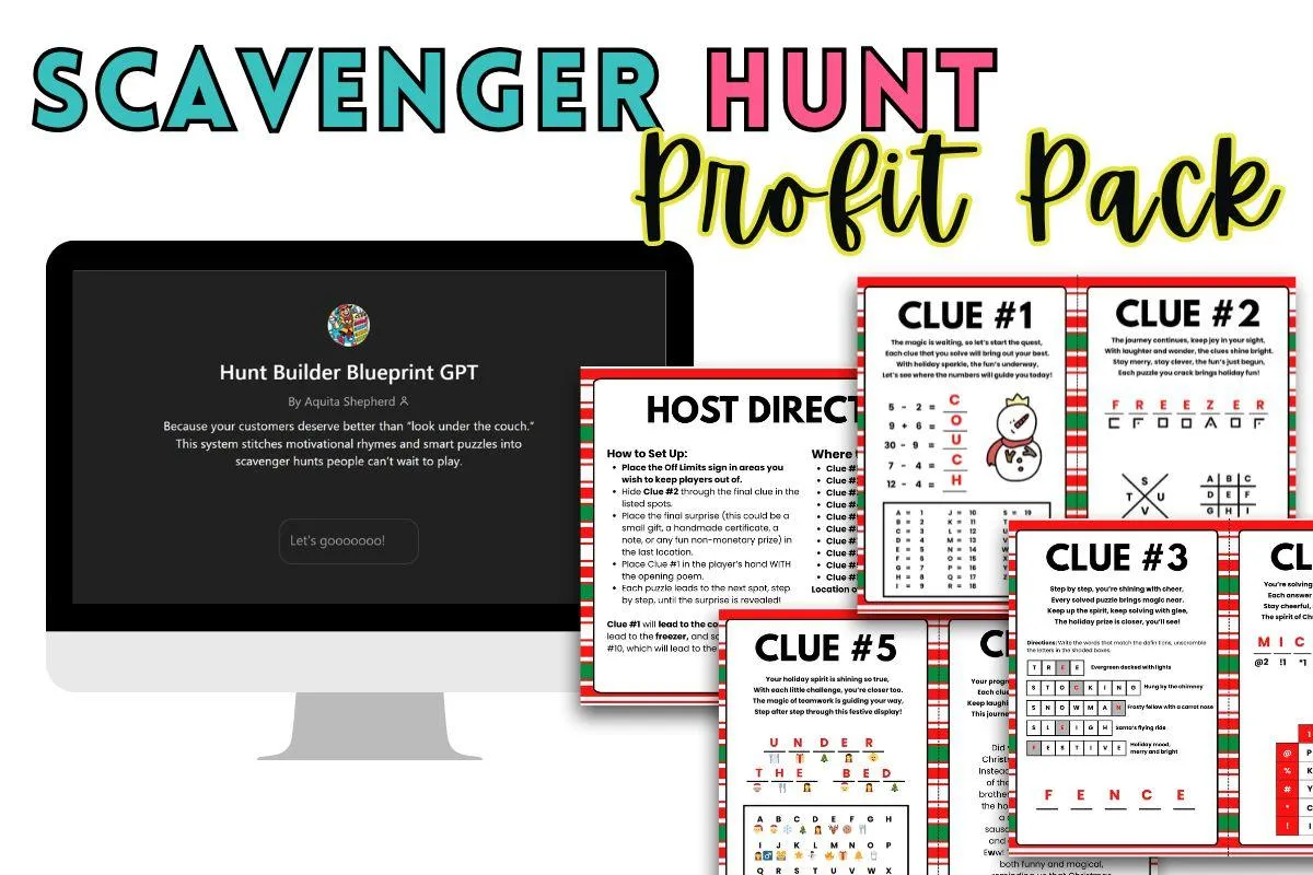 Skip the guesswork. Build and list hunts for ANY occasion in record time with the Scavenger Hunt Profit Pack. Turn clues into cash with ready-to-use templates, tutorials, and a custom GPT sidekick.